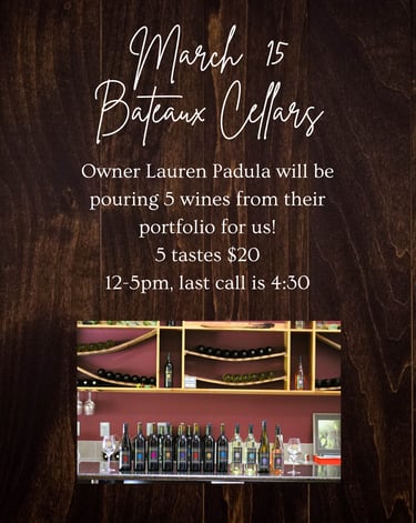 Lauren from Bateaux Cellars in Toledo, WA, is coming to pour for us on March 15!